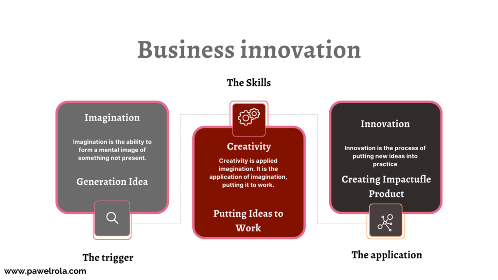 But before innovation can flourish, imagination and creativity are needed. The relationship between imagination and creativity is presented below based on a model. It describes ways in which people learn in a natural environment. We can utilise it to enhance and improve business performance and results, which can be treated as a learning process and implementation of learning results in a business context. Figure 1 illustrates the process for implementing business innovation.