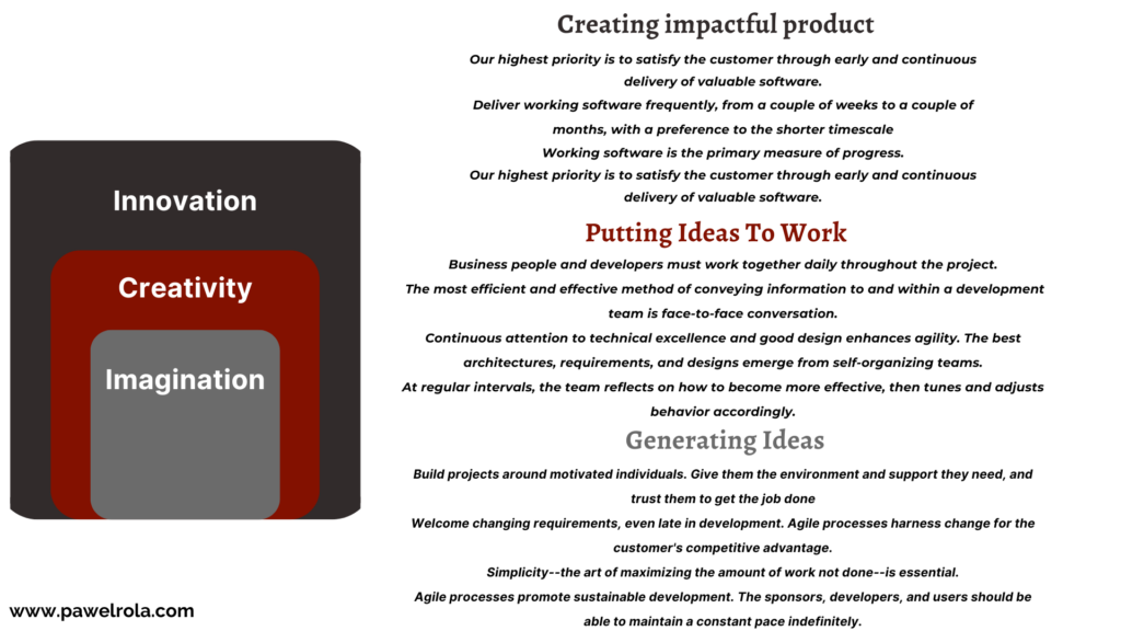 Figure 2 illustrates which agile principles can support and govern behaviours in the specific step of business innovation. Three previously mentioned innovation steps ( Imagination, Creativity, and Innovation) were matched with 12 Agile principles.